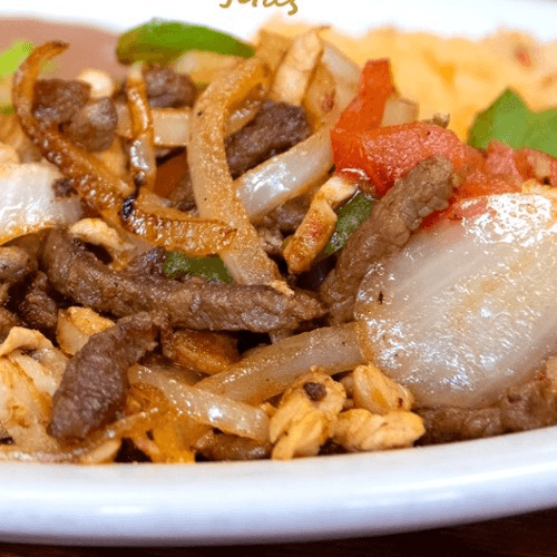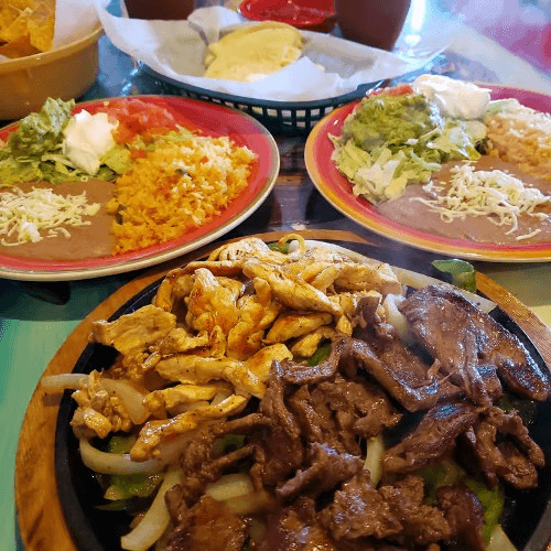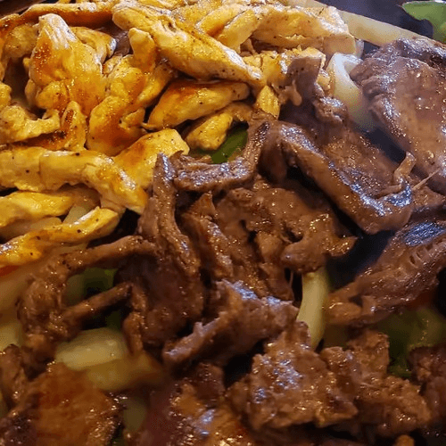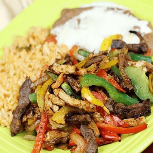 Grilled steak and chicken with onions and peppers. Served with rice, choice of refried or black beans, side of lettuce with sour cream, tomatoes, guacamole, and three flour tortillas