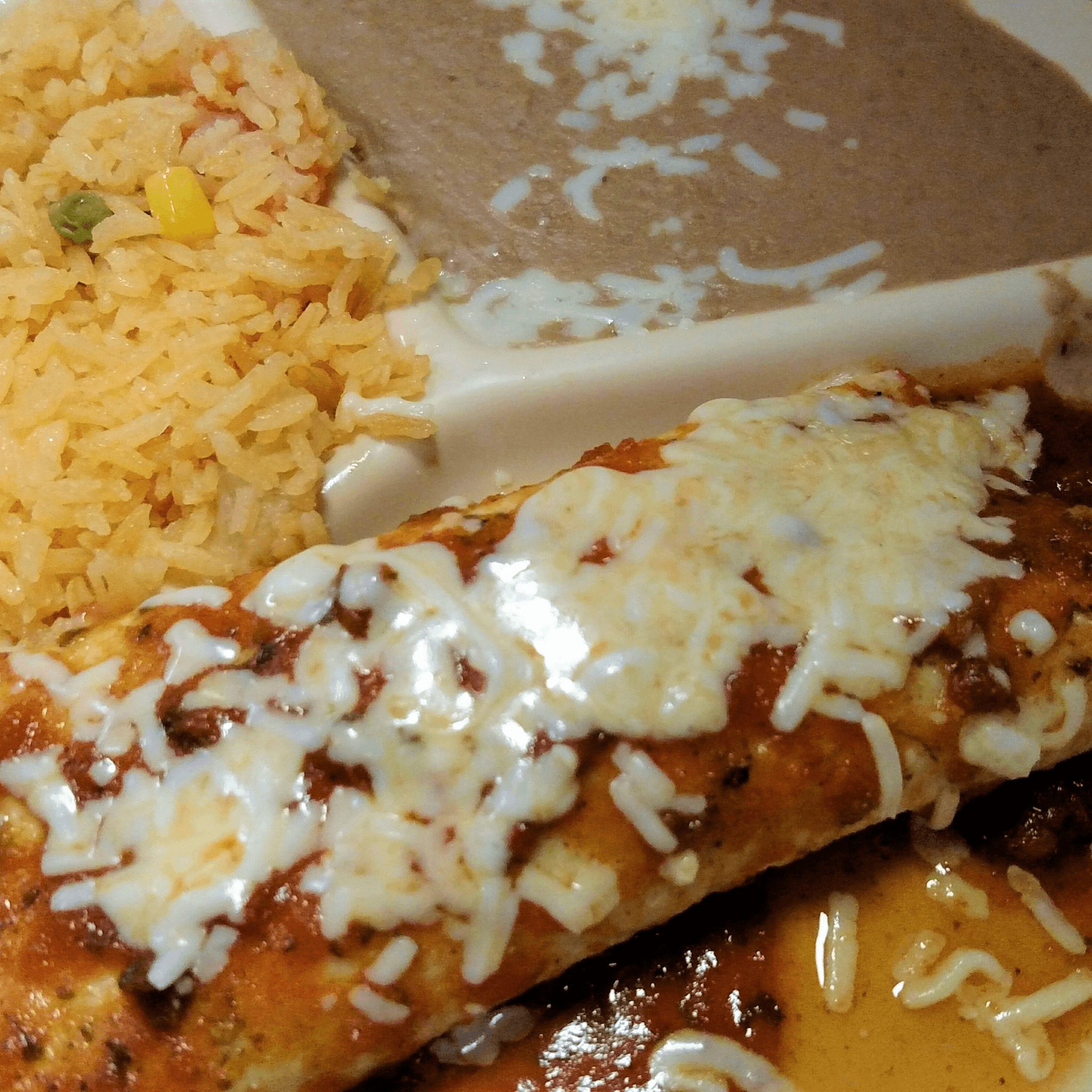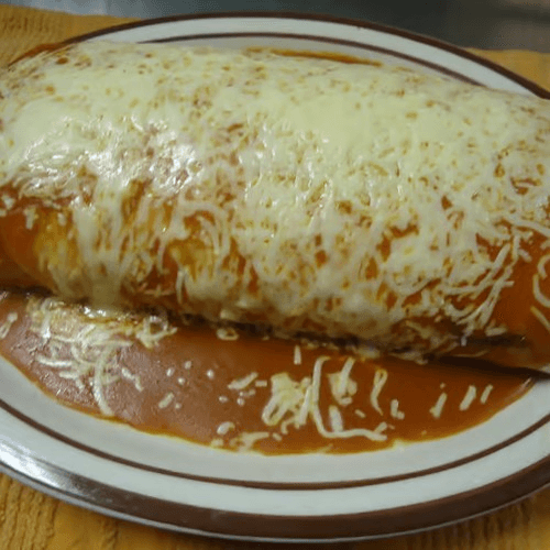 Stuffed with rice, beans, pico de gallo, sour cream and guacamole. Covered with enchilada or queso sauce