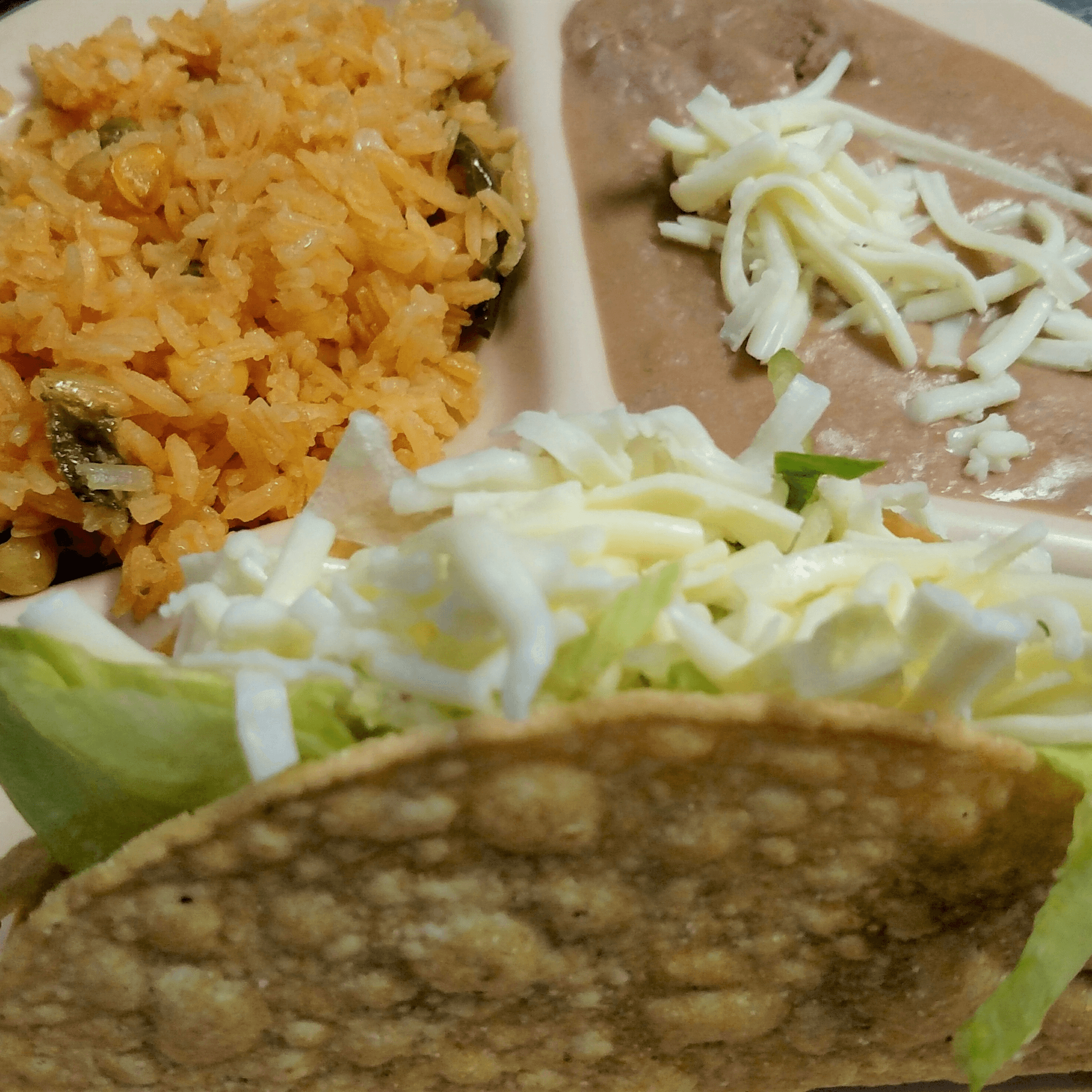 2 soft tacos - served with lettuce, cheese and pico de gallo and sides of rice and beans