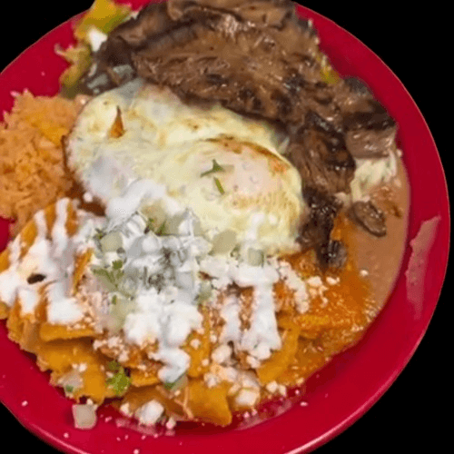 Fried corn tortilla chips covered with warm half red and half salsa verde, topped with carne asada, two fried eggs, queso fresco, sour cream, onions and cilantro. Served with a side of rice and beans –