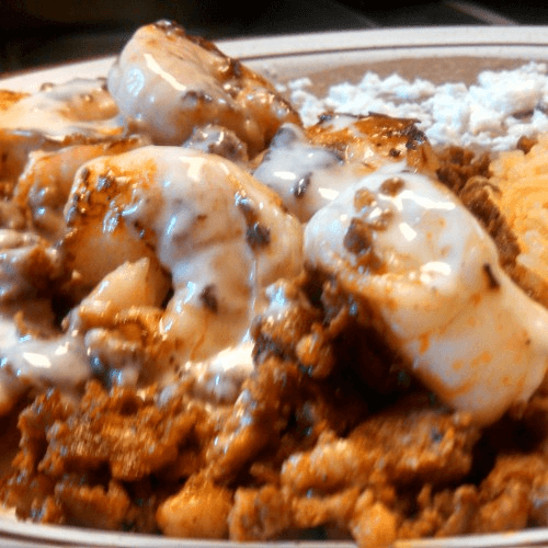 Grilled shrimp, chicken, and chorizo covered with our homemade queso. Served with rice, beans, and tortillas