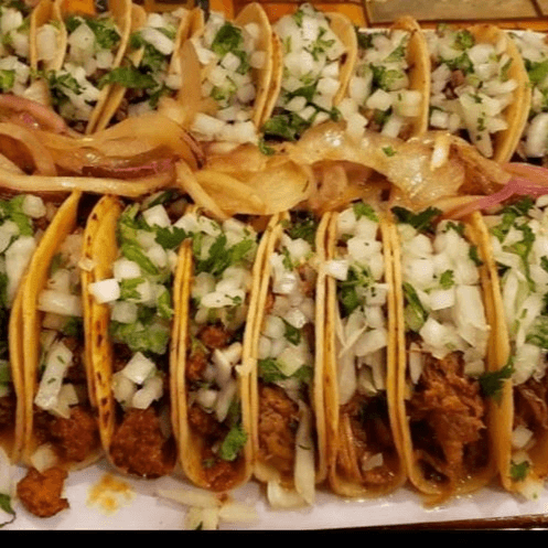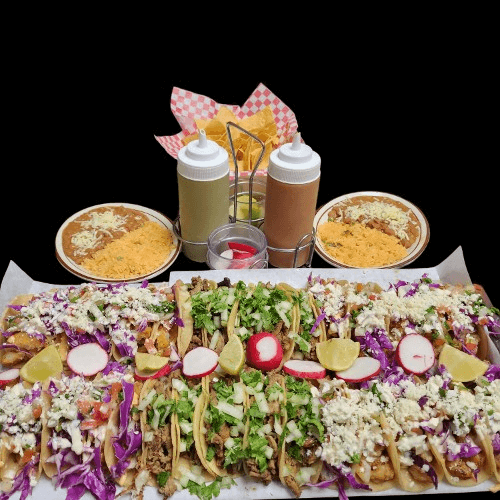 40 Street Tacos with choice of meat with onions and cilantro. ides of rice, bean, chips, salsas, limes and radishes.