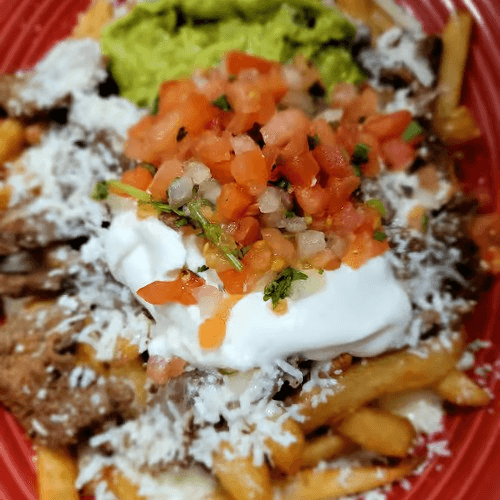 French fries covered with grilled steak, cheese, guacamole, sour cream, pico de gallo, jalapeños, and queso fresco