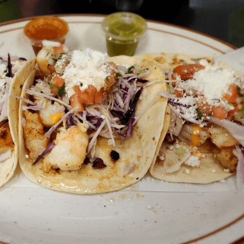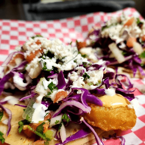 Two corn tortillas with beer-battered cod, topped with cabbage, pico de gallo, fresh Mexican cheese, sour cream, and our homemade Mexican tartar sauce. Served with a side of rice and beans