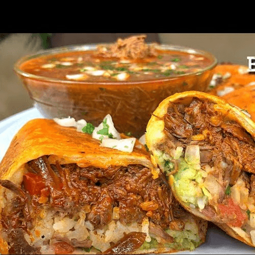 Large flour tortilla stuffed with our homemade Birria, onions, cilantro and 3 cheese blend. Served with side of rice, beans, broth for dipping, and sides