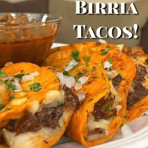 3 pieces. This Birria tacos with beef are cheesy, delicious—a true showstopper. It begins with braising a Birria de rez and then making a consomé and frying up tacos with Oaxacan cheese. Served with rice and beans