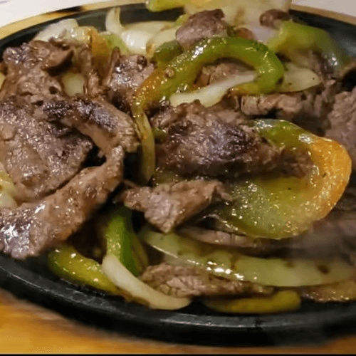 Grilled steak or chicken with onions and peppers. Served with rice, choice of refried or black beans, side of lettuce with sour cream, tomatoes, guacamole, and three flour