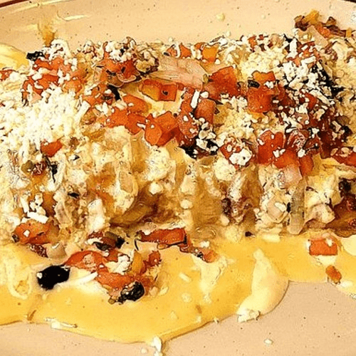 2 cheese enchiladas topped with 2 ranchero style eggs covered with our warm tomatillo salsa, Mexican cheese and cilantro. Served with rice and beans