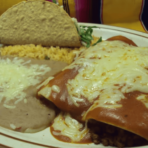 Two fried beef or chicken burritos topped with homemade queso, lettuce, guacamole, sour cream, and tomatoes. Served with rice and beans