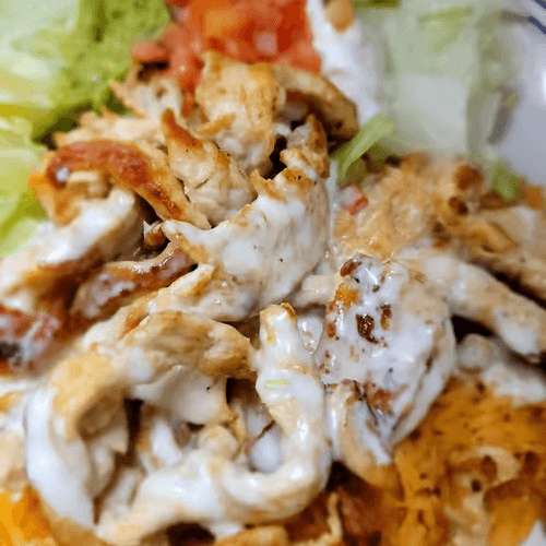 Homemade fried tortilla chips baked and topped with queso, ground beef, shredded chicken, beans, guacamole, tomatoes, and sour cream