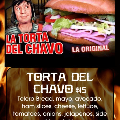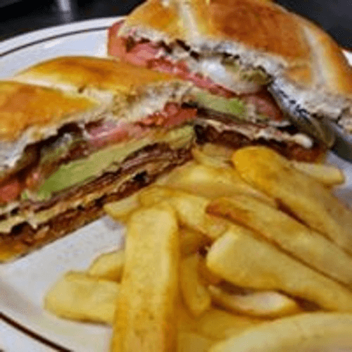 Mexican sandwich with Toasted Telera Bread, Mayo, avocado, ham slices, cheese, lettuce, tomatoes, onions, jalapenos. Served with side of French Fries