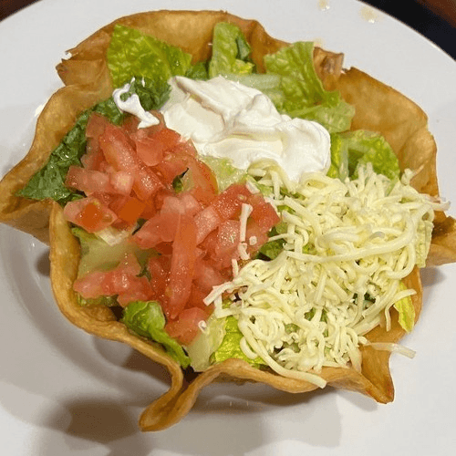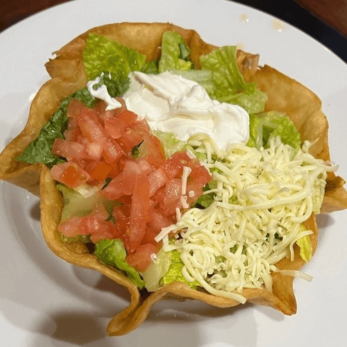 Crispy flour tortilla bowl filled with your choice of ground beef or chicken, beans, lettuce, tomatoes, sour cream, and shredded cheese