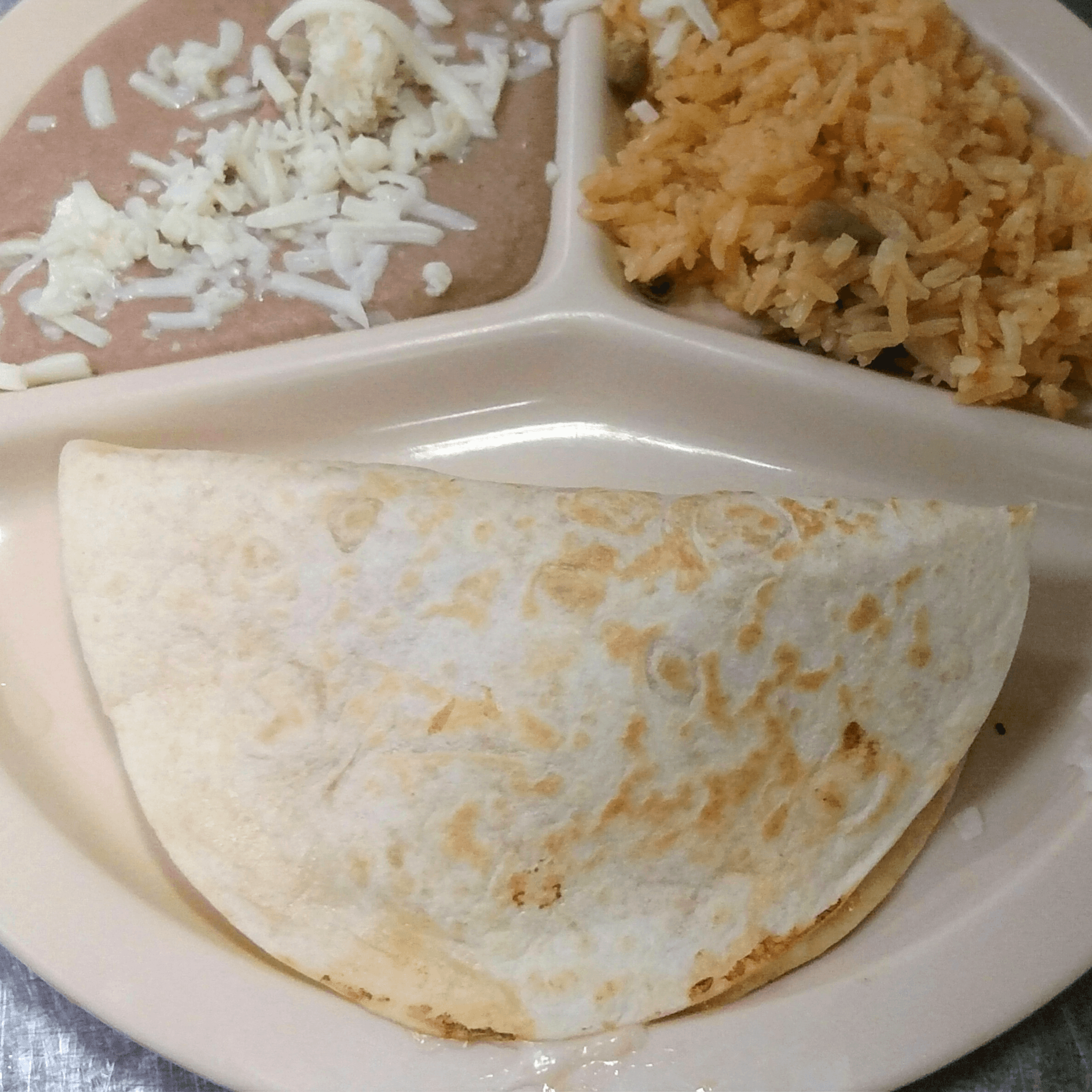 Jumbo size quesdailla stuffed with a Mexican cheese blend. Served with side of rice, beans, pico de gallo and sour cream