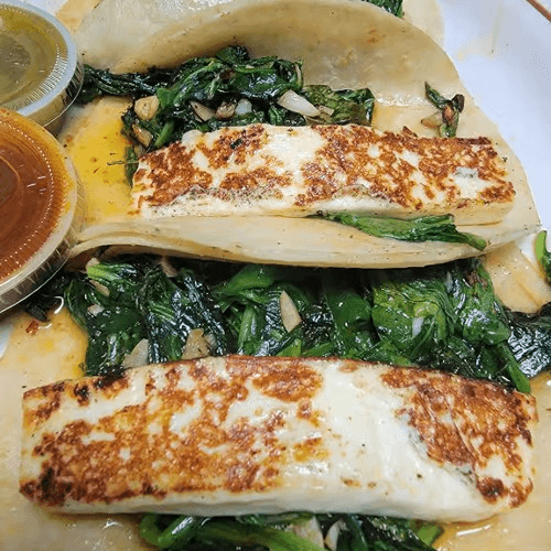 3 pieces. Soft corn tortilla tacos with grilled Mexican cheese and spinach. Served with rice, black beans, and garnishes