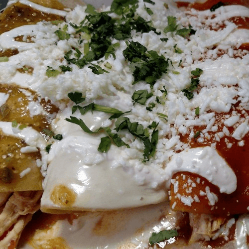 Three chicken enchiladas each covered with a different sauce: queso, verde, and our house enchilada sauce. Topped with sour cream, cilantro, and Mexican queso fresco. Served with rice and beans
