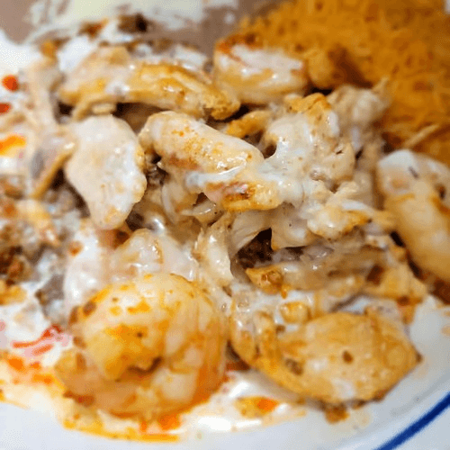 2 Cheese enchiladas topped with grilled chicken and shrimp. Smothered with queso and pico de gallo. Served with rice and beans.