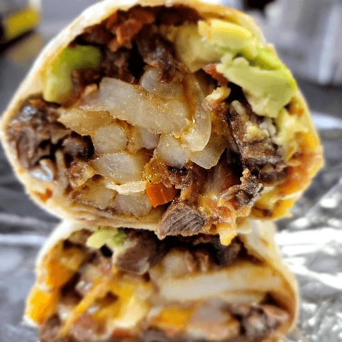 Choice of meat, rice, whole pinto beans, cheese, lettuce, onions, cilantro, sour cream and salsa Verde. Grilled and wrapped in aluminum foil. This one you can pick up and bite in