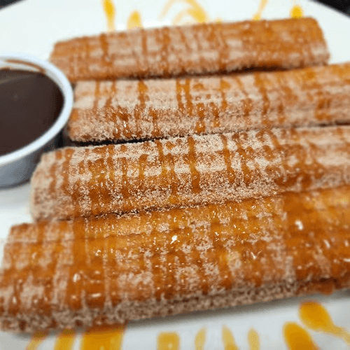Mexican pastry sticks rolled in cinnamon and sugar, covered with chocolate syrup and honey