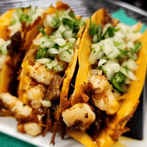 3 Soft corn tortilla tacos with seared cheese, steak, shrimp, onions, cilantro and guacamole salsa. Served with rice and beans