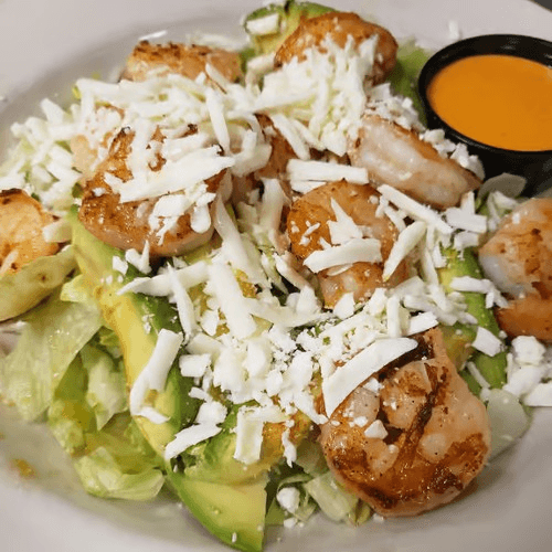 Grilled shrimp on a bed of chopped lettuce with avocado slices, Mexican cheese, pico de gallo and side of house dressing