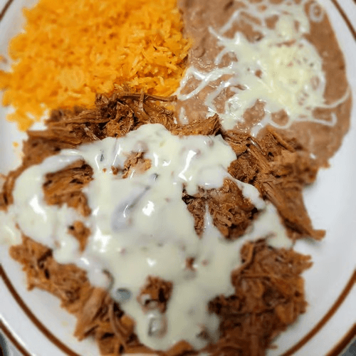 Shredded beef barbacoa topped with queso and served with rice, beans and flour tortillas