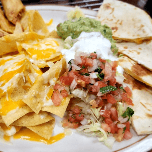 Cheese Nachos, 2 chicken taquitos, 2 chicken flour tortilla flautas, 2 cheese quesadillas, Side of lettuce with guacamole, pico de gallo, sourcream.